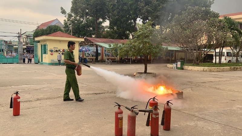 Đồng chí Huỳnh Sỹ Nguyên hướng dẫn thực hành tắt lửa từ bình ga khi cháy khí ga.